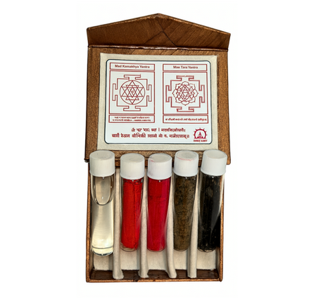 The yantra is a beautifully crafted wooden box, containing five powerful divine elements: